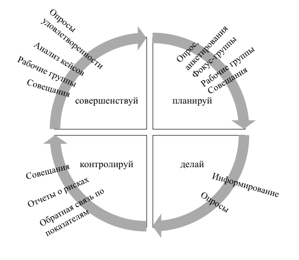Процессы управления – это совокупность процессов, предполагающих реализацию ключевых функцией управления (планирование, организацией, мотивация, контроль) для достижения организацией поставленных целей. Процессы управления ориентированы на поддержку принятия решений как на стратегическом, так и на оперативном уровнях, направленных на устойчивое развитие. По мнению Г. Щедровицкого, процессы управления являются деятельностью над деятельностью . В качестве клиентов таких процессов выступают как внешние, так и внутренние заинтересованные лица. При этом любой процесс управления имеет стадии протекания процесса, согласно управленческому циклу PDCA: планирование, реализация, контроль, совершенствование. Соответственно, реализация каждого этапа предполагает вовлечение заинтересованных лиц для повышения эффективности процессов управления. Важным в этой связи является выбор наиболее действенных механизмов вовлечения.