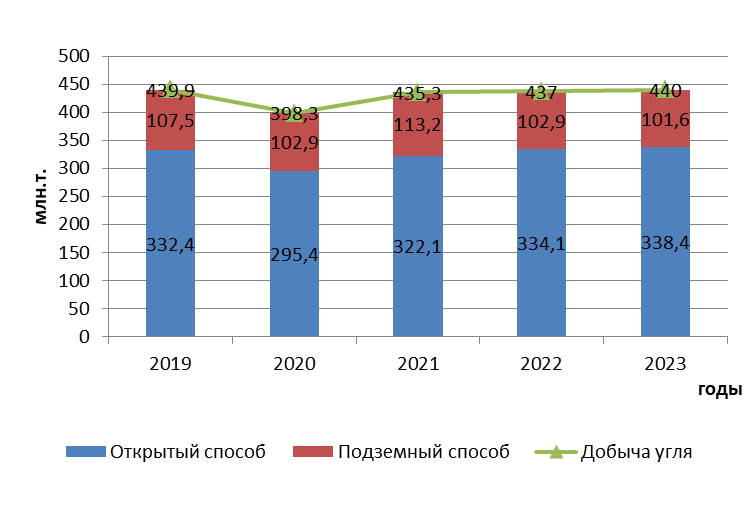 Рисунок 2 - Динамика объема добычи угля в России по способам добычи за 2019-2023 гг.