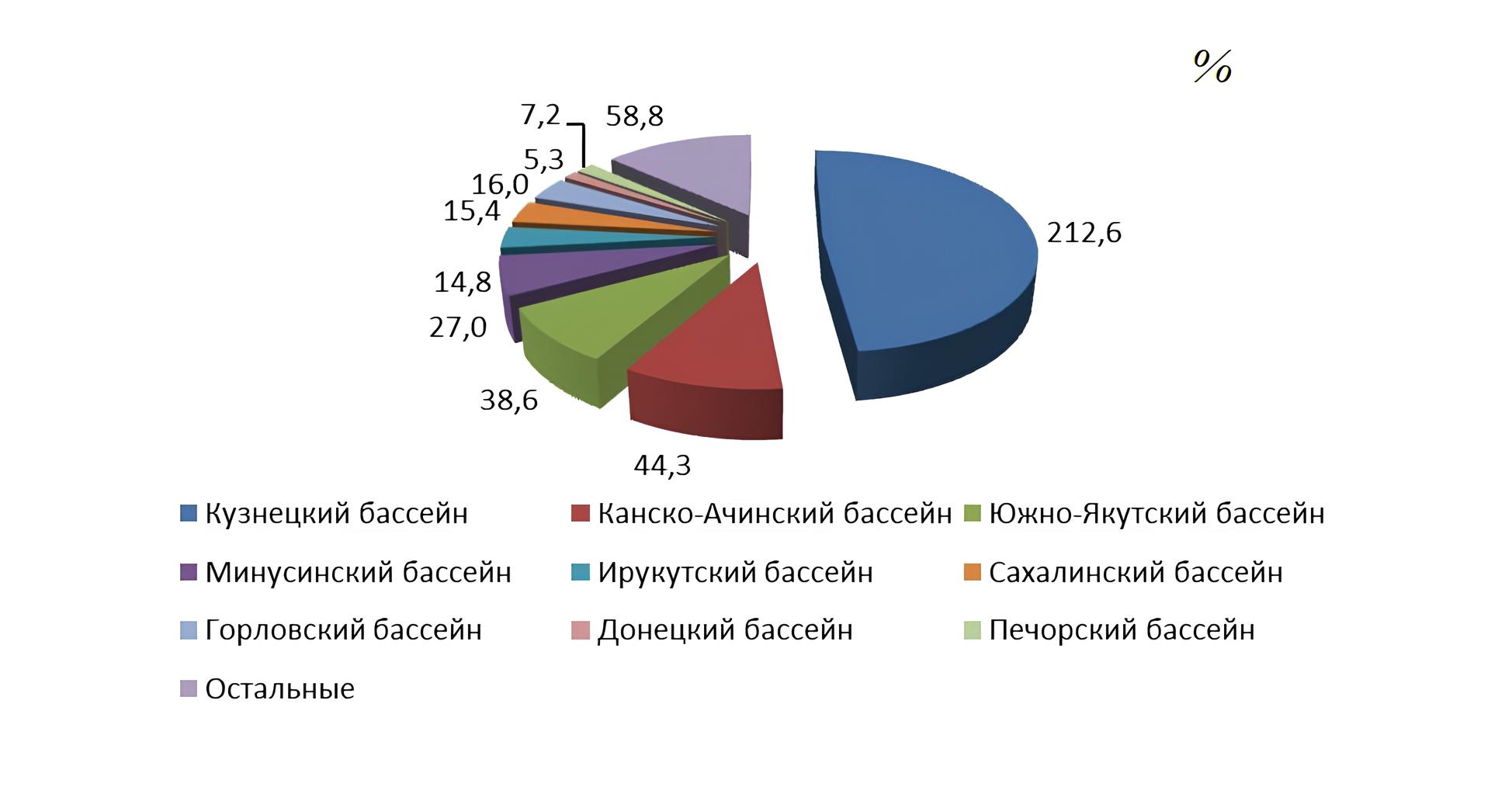 Рисунок 3 - Распределение добычи угля по основным угольным бассейнам России в 2023 году