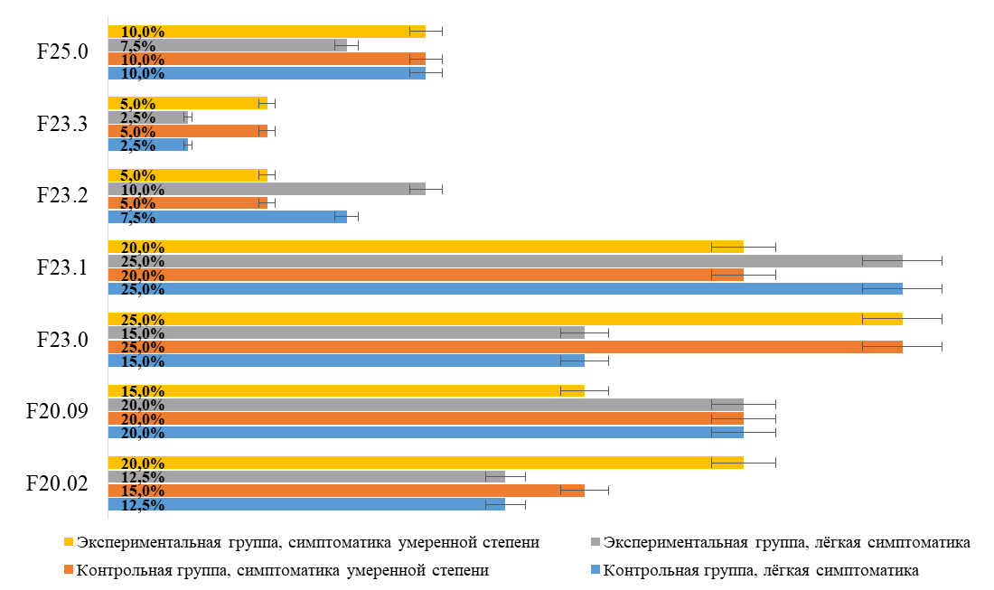 В настоящем исследовании проведена оценка синдромальной и нозологической принадлежности в двух группах (и двух подгруппах) с использованием Международной классификации болезней 10 пересмотра (МКБ-10) (Рис.1, Рис.2). Результаты показали высокую степень соответствия клинической картины и установленных диагнозов, что подтверждает надежность используемых диагностических инструментов.