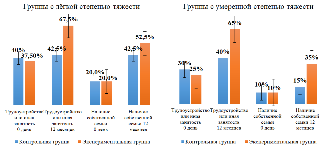 За период наблюдения в ходе реабилитации отмечалось уменьшение выраженности общей психопатологической симптоматики (по шкале PANSS), а также снижение интенсивности ряда её компонентов, таких как нарушение суждений и критики, волевых нарушений, дезорганизации мышления, враждебности и социальной изоляции. Компенсация по шкале PANSS в «Экспериментальной» группе, за весь период наблюдения, составила более 40% в обеих подгруппах, тогда как в «Контрольной» группе динамика варьировалась от 17,5% до 18,75% (Рис. 3). Было зафиксировано положительное изменение в личном и социальном функционировании, затрагивающее сферы социально полезной деятельности, взаимоотношения с близкими и самообслуживание. Наблюдался рост тенденции к улучшению трудового статуса, а также увеличилась удовлетворённость пациентов предоставляемыми услугами психиатрической помощи, в том числе благодаря улучшению общения и результатам психологической поддержки. В экспериментальной группе, вне зависимости от степени проявления расстройства, более трети пациентов в каждой из групп после прохождения реинтеграционных трудовых мероприятий, в последующем были трудоустроены на постоянное место работы, в то время как в контрольной группе данная тенденция отмечалась не более чем в 10% случаях. Увеличение доли совместно проживающих в собственных семьях в представленных группах при лёгкой симптоматике - 22,5%, при умеренной – 5%, и после программы реабилитации положительная динамика была более равномерной и составила 32,5% респондентов с лёгкой и 25% с умеренной симптоматикой (Рис. 4). Было замечено сокращение количества повторных госпитализаций и лечения в дневном стационаре по сравнению с теми пациентами, которые не участвовали в реабилитационной программе. Согласно нашим данным, на эффективность реабилитации влияют такие факторы, как нарушения мышления, позитивные симптомы, общая тяжесть психического расстройства, частота госпитализаций, а также мотивированность родственников пациентов участвовать в реабилитационных программах. Положительные изменения коснулись улучшения социального функционирования, трудового статуса, удовлетворённости получаемой помощью, уменьшения частоты повторных госпитализаций и переводов в дневной стационар.