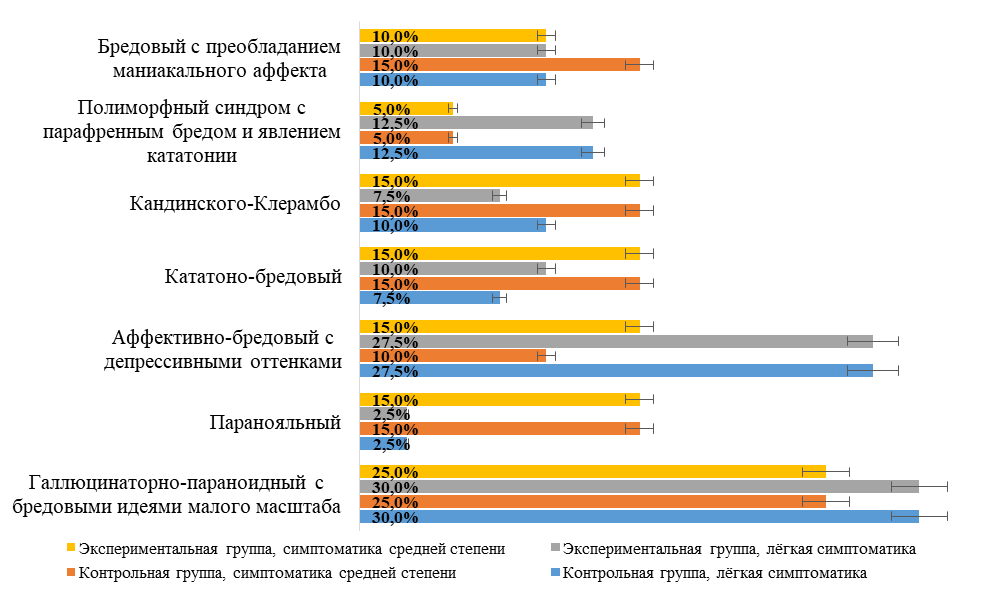 Клиническая картина группы пациентов с умеренно выраженной степенью выраженности симптоматики характеризовалась гетерогенностью проявлений с императивными, комментирующими и угрожающими вербальными псевдогаллюцинациями. Эпизоды развернутой бредовой фабулы включали идеи преследования, воздействия, проявляющихся в тревожности, бессоннице, агрессивном поведении и настороженности в отношении персонала и близких. Нарастающая социальная отгороженность проявлялась в минимизации поддержания контактов с родственниками, снижении эмоциональной экспрессии. Полярность аффективных проявлений отмечена чередованием безразличным отношением к происходящему, сменяющаяся, в период острого состояния, на агрессию, раздражительность и аутоагрессивное поведение.