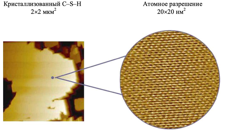 Рисунок 3 - Наноразмерная структура С–S–H, кристаллизованная на кальцитной подложке и обнаруженная при помощи АСМ (атомно-силового микроскопа)