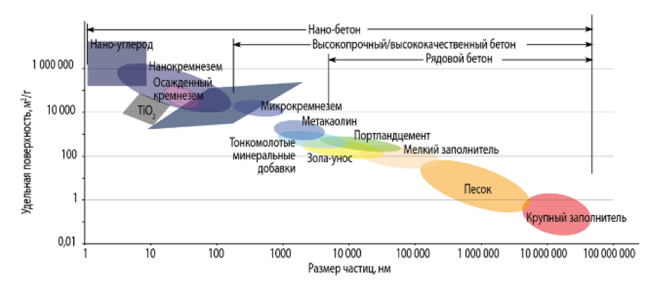 Рисунок 1 - Размер частиц и удельная поверхность компонентов бетона