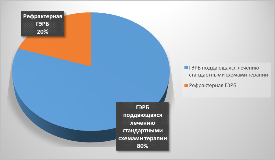 По данным исследования выявлено, что большую часть, из 500, исследованных амбулаторных карт, 80% составляют амбулаторные карты пациентов с диагнозом ГЭРБ, которая поддается лечению стандартными схемами терапии. И только 20% составляют случаи, когда наблюдается рефрактерное течение заболевания (рис. 1).