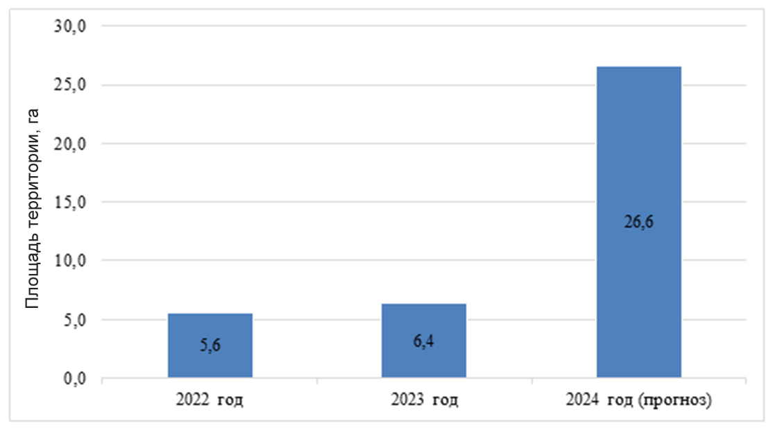 Общая площадь территории, в отношении которой заключены договоры | га | 5,6 | 6,4 | 26,6 |