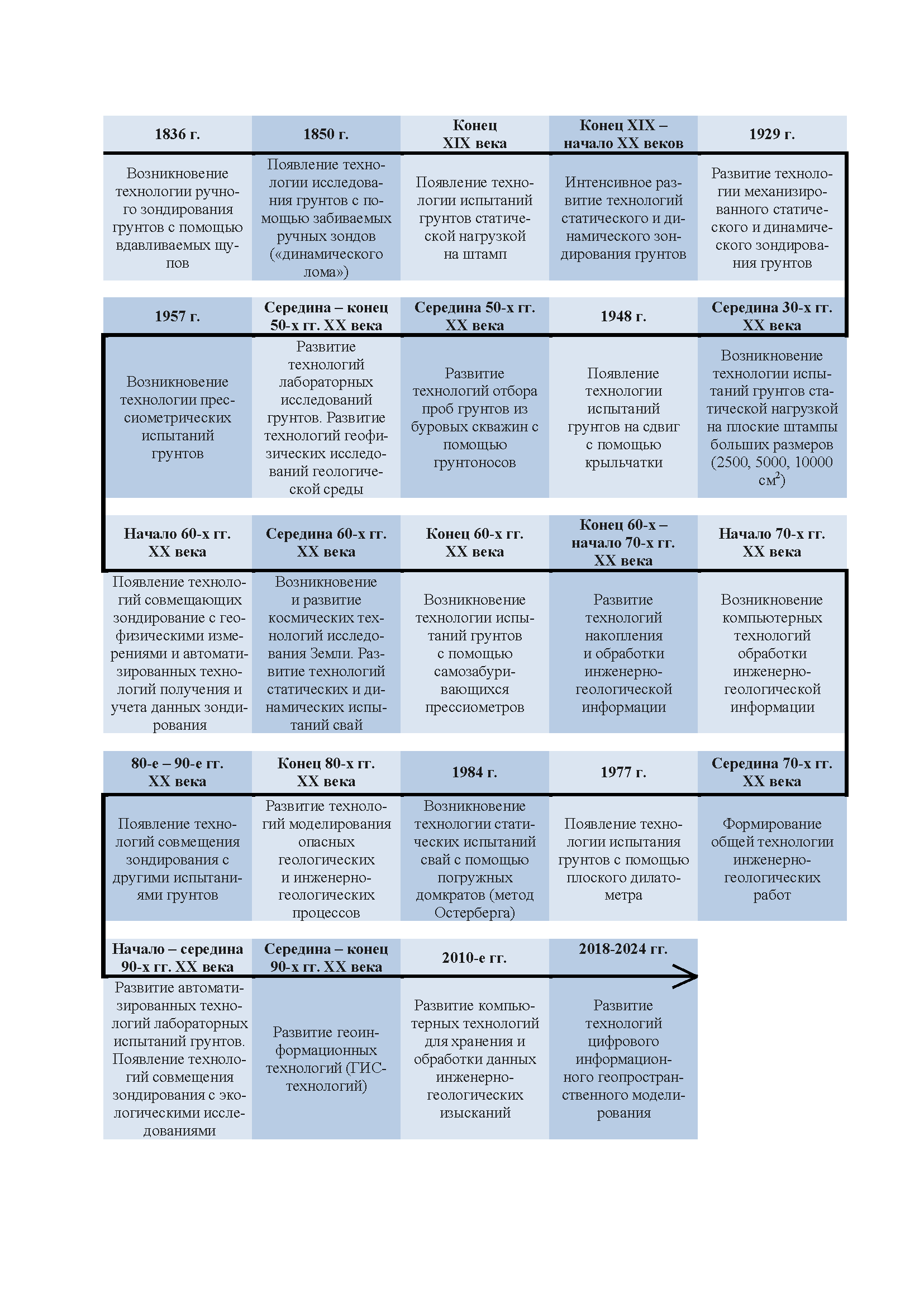Рисунок 1 - Основные этапы развития технологий инженерно-геологических изысканий для строительства