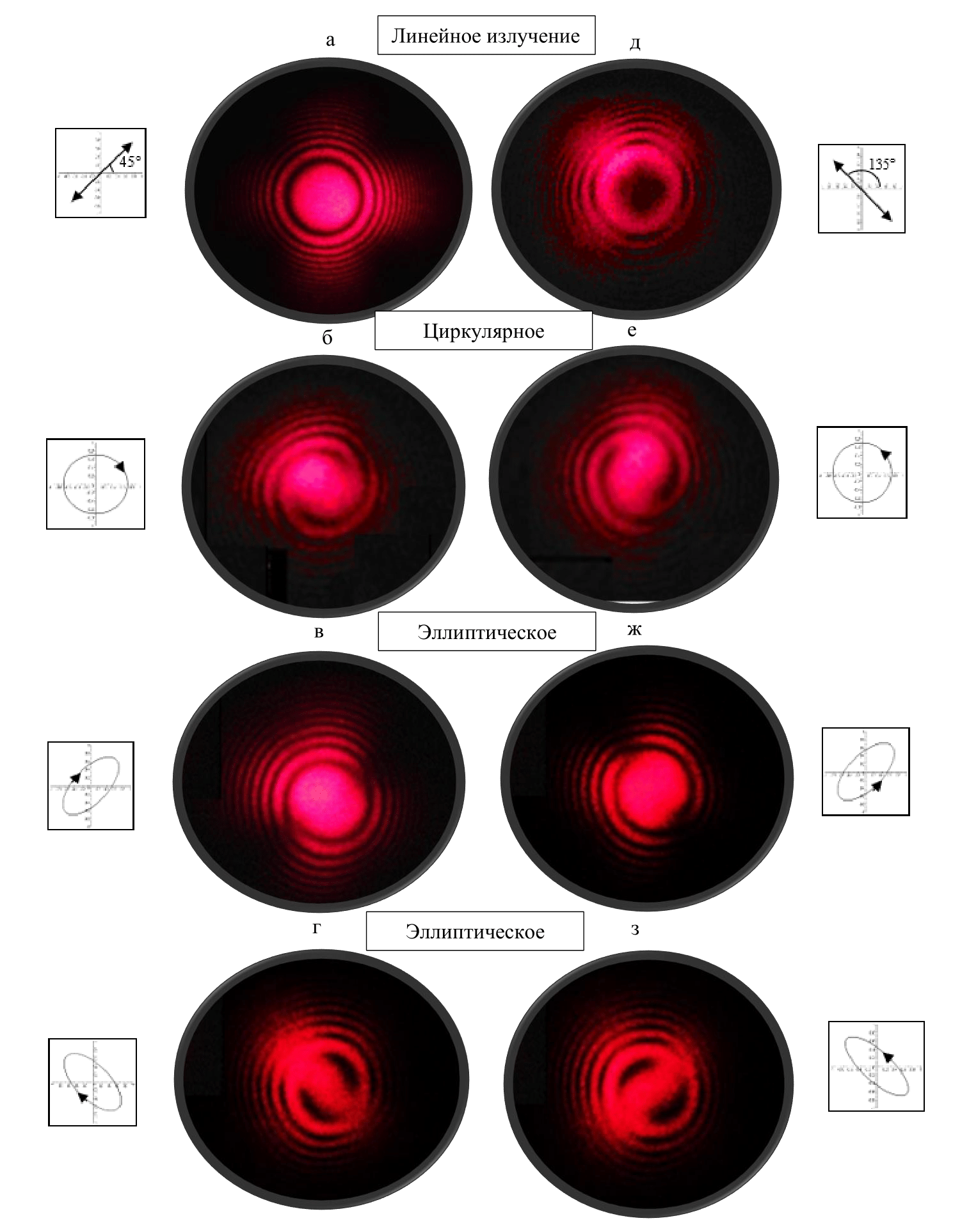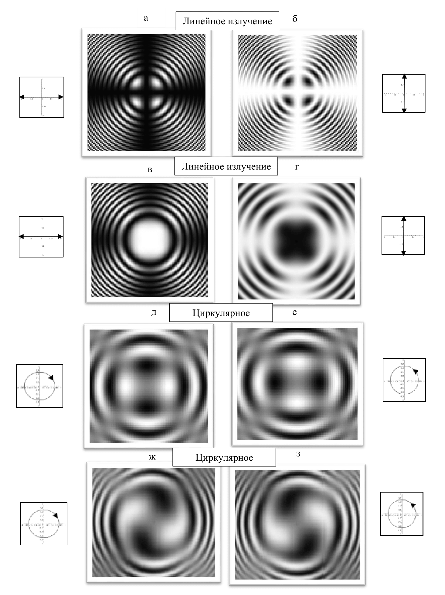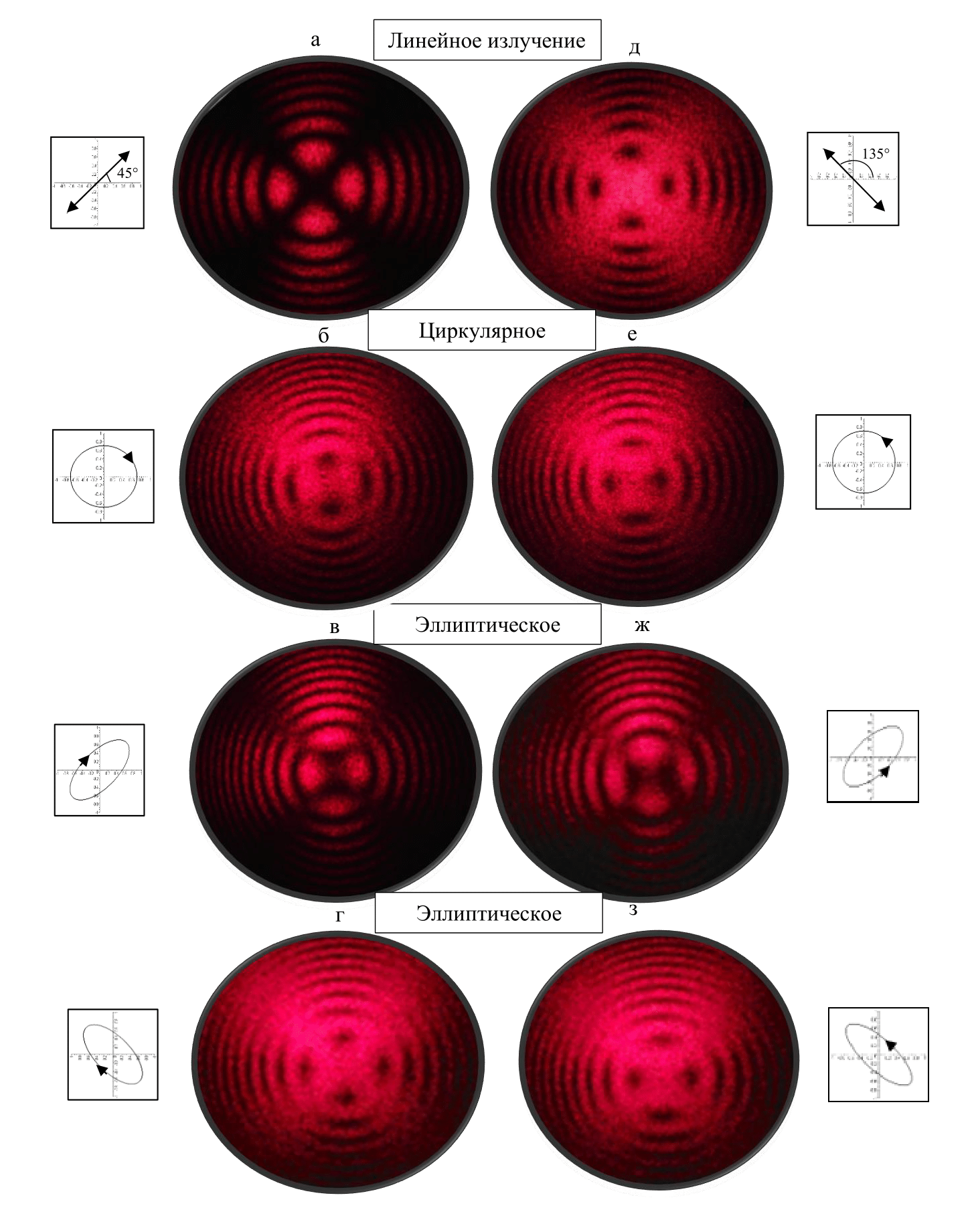 Эксперимент показал, что излучение с линейной поляризацией формирует два вида коноскопических картин для каждого кристаллического образца. Первый вид — это коноскопическая картина негиротропного кристалла ниобата лития в виде черного «мальтийского креста» на фоне колец-изохром (линий одинаковой разности фаз) (рис. 2, а). При повороте на 90° вектора Е входящего в кристалл излучения (ортогональная поляризация) имеет место второй вид коноскопической картины — она становится дополнительной, при этом черный «мальтийский крест» превращается в светлый (рис. 2, д).
