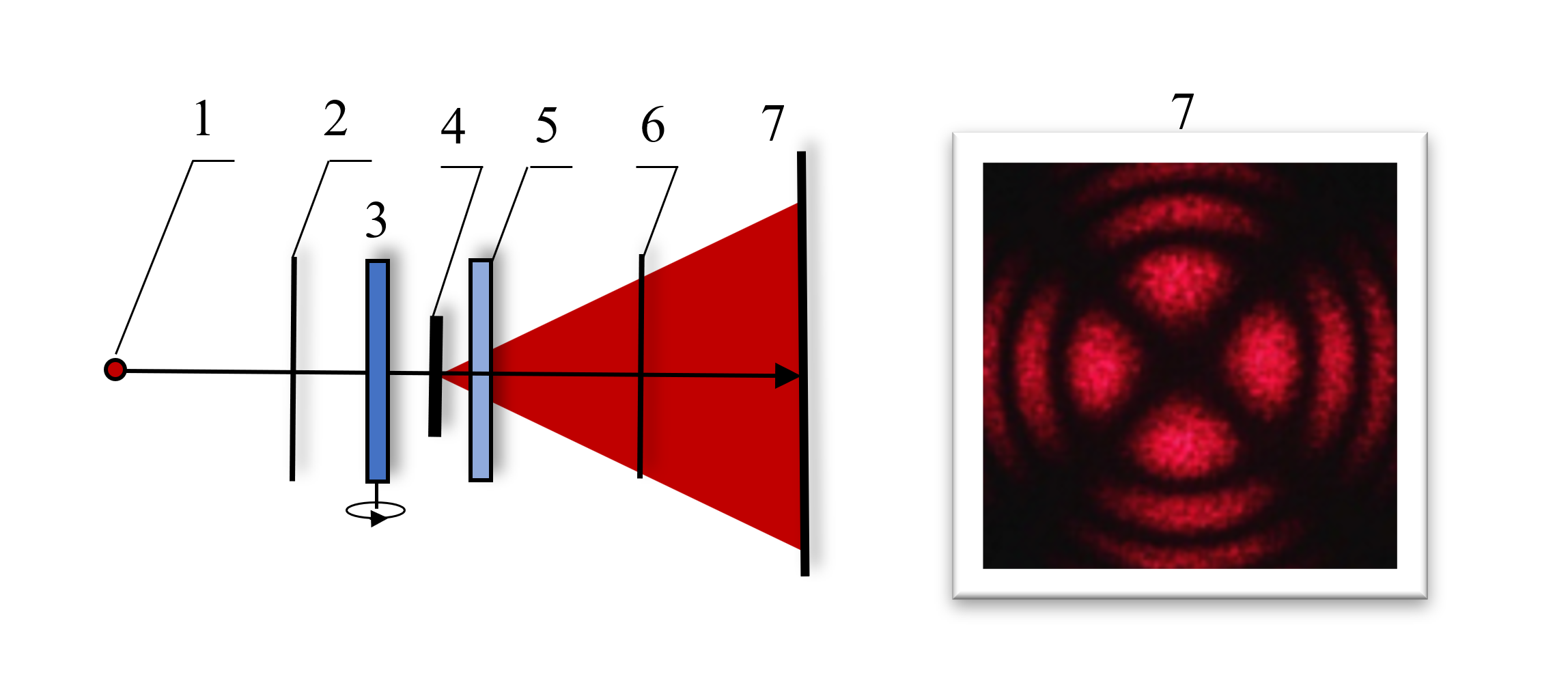 1 – лазер; 2 – поляризатор; 3 – фазовая пластинка λ/4; 4 – рассеиватель; 5 – кристаллическая пластинка, вырезанная перпендикулярно оптической оси; 6 – анализатор; 7 – экран
