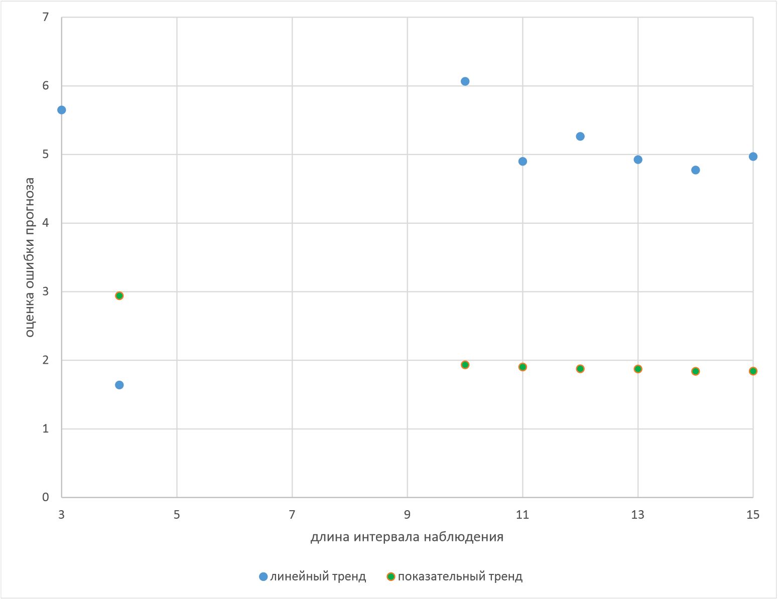 Результаты расчетов оценок ошибок прогноза для линейного и показательного тренда приведены на рис.3.
