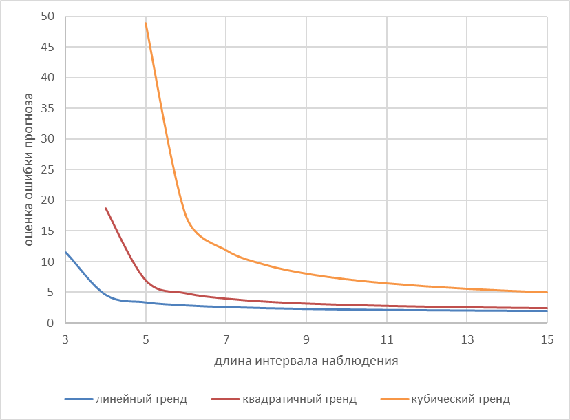 Для решаемой задачи квадратичная и кубическая модели оказались непригодны: варианты этих моделей практически для всех длин интервалов наблюдения пришлось исключить ввиду недостаточной статистической значимости уравнения модели или его коэффициентов. Единственная статистически значимая модель – кубический тренд для пятнадцатилетнего интервала наблюдения в два раза уступает по точности прогноза линейному тренду для той же длины интервала наблюдения.