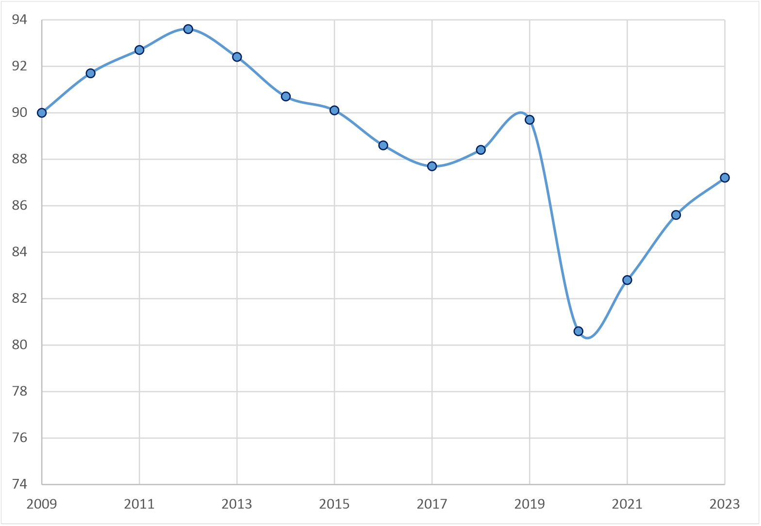 2013 | 92,4 | 2018 | 88,4 | 2023 | 87,2 |