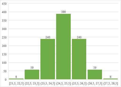 В соответствии с методикой в начале была сформирована генеральная совокупность, состоящая из 1000 элементов со строго нормальным распределением (рис. 1). При этом математическое ожидание mx = 25, а стандартное отклонение σ = 1.