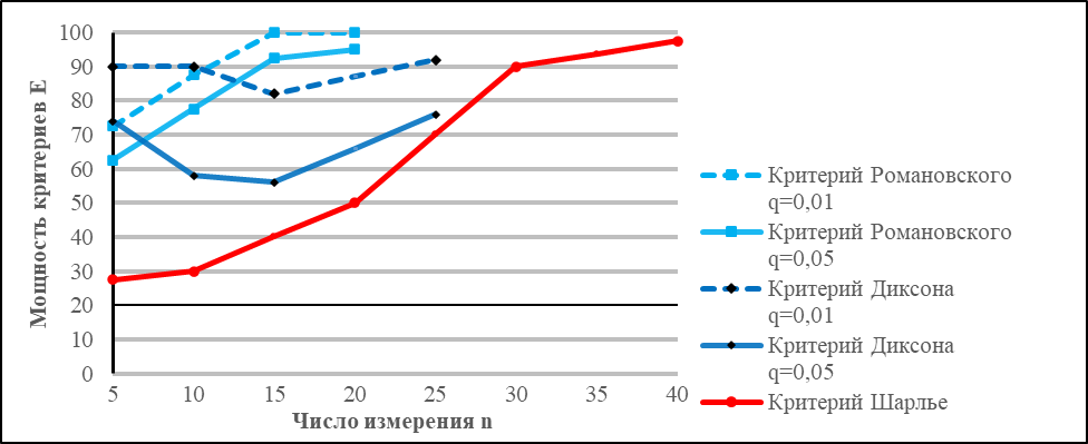 Анализируя полученные результаты теоретического эксперимента, было произведено сравнение мощности критерия Шарлье с данными работ , , где приведена информация об эффективности критериев Диксона и Романовского, которые широко используются при выявлении выбросов.
