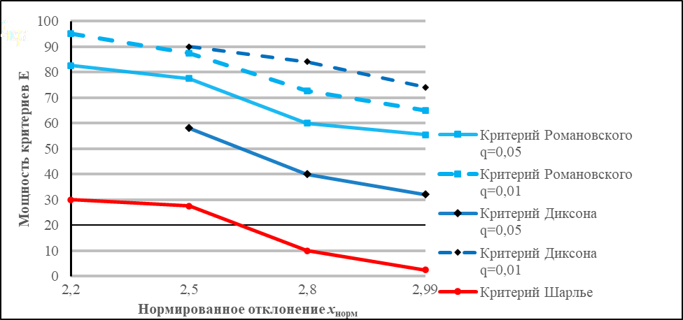 Мощность таких критериев и их сравнительный анализ достаточно хорошо описаны в открытой печати, например, в работе . Однако, анализ современной литературы показал, что в открытых источниках имеется противоречивая информация о критерии Шарлье. В работе вообще не рекомендуется использовать критерий Шарлье при любом количестве измерений.