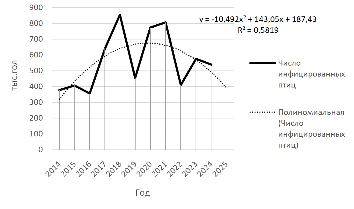 Для прогноза заболеваемости наиболее подходящей моделью оказалась полиномиальная функция второй степени, которая демонстрирует наибольший коэффициент детерминации (рис. 3). Прогнозируемое количество зараженных птиц в 2025 г. составит 393 тыс. голов. Сравнив этот прогноз с фактическими данными 2024 г., можно ожидать снижение заболеваемости на 36%.