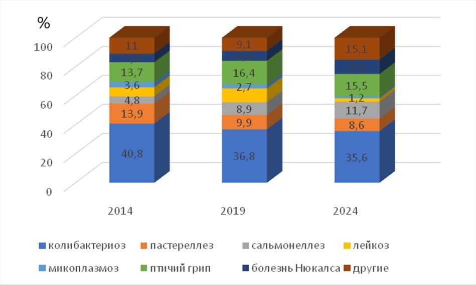 Согласно рисунку 1, значительную долю в структуре заболеваемости заразными инфекциями колибактериоз 35,6–40,8% и птичий грипп 13,7–15,5%. В 2024 г. Болезнь Ньюкасла выявлена у 9,9% от общего количества неблагополучных пунктов, сальмонеллез – 11,7 пастереллеза – 8,6%. Среди прочих установлены вспышки тиф-пуллауроз – 0,3%, орнитоза – 0,5%, туберкулеза – 0, 3% и др.