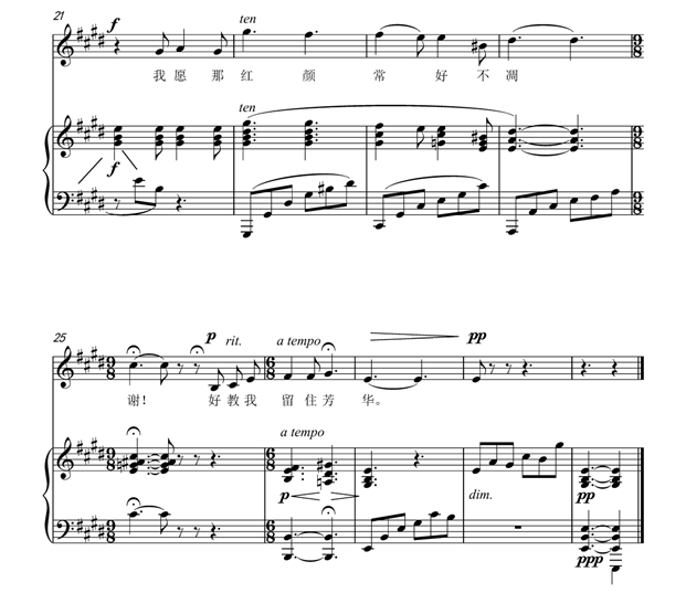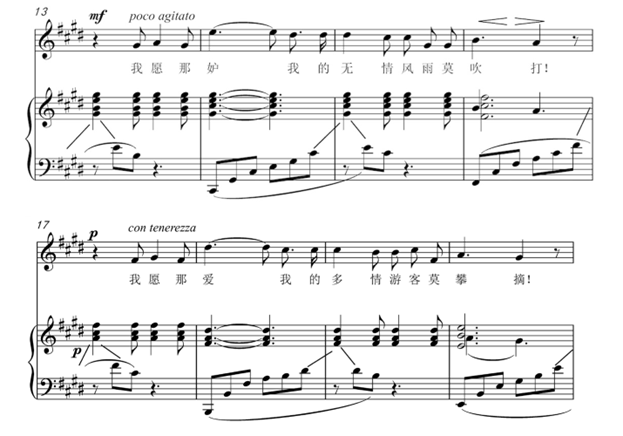 At the beginning of the XX century, artistic songs, an important genre of the Romantic era, were imported to China from Europe. Amid the fusion of Chinese and Western cultures, Chinese composers sought ways to preserve the national character of artistic songs in their works. Among them, the composer Huang Tzu used Chinese poems to create the art song ‘Three Wishes of a Rose’, which was a typical representative of this period. Its subtle and introverted Chinese aesthetic style contrasts sharply with European romanticism. Not only this, but also the spirit of traditional Chinese culture and the subtext embedded in the song give Chinese art song a unique charm.