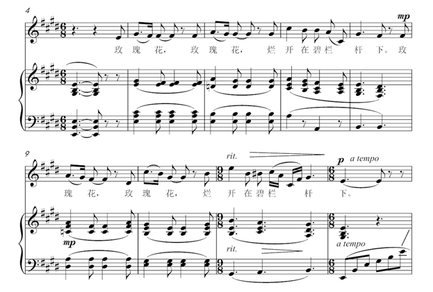 Раздел A начинается со слабого начала, ведущего к мелодии «Розы, розы, розы, розы цветут под голубыми перилами», изображающей состояние роз в нежном цвету. В нем используется традиционное китайское выражение «фу». Слова второй фразы повторяют первую, а мелодия имитирует интервалы и ритмические изменения, основанные на первой фразе, еще больше углубляя эмоции. Последнее слово продлевает длительность мелодии, заканчиваясь на доминантной ноте и оставляя бесконечное послевкусие. В аккомпанементе для фортепиано Хуан Ц. умело использует нежные колончатые аккорды в качестве основной темы, создавая безмятежную и прекрасную атмосферу, которая перекликается с мелодией и служит хорошим фоном для основной темы (рис. 1).