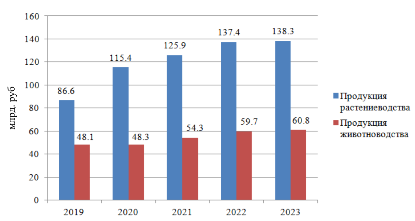 Исходя из этого, возникает необходимость проанализировать Липецкую область, где агропромышленный комплекс (АПК) является одним из ключевых составляющих экономики региона и демонстрирует положительную динамику в последние годы. Основные аспекты развития АПК, включают рост объемов производства, увеличение экспорта, а также активное привлечение инвестиций. Так, в Липецкой области наблюдается устойчивый рост объемов производства сельского хозяйства за период с 2019 по 2023 годы. Этот рост отражает как увеличение площадей посевов, так и улучшение технологий в аграрном секторе.