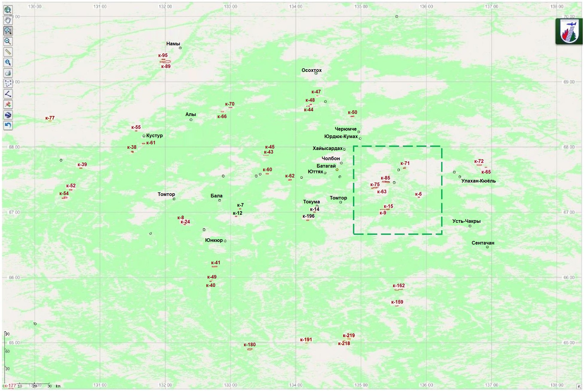 Долее детально были проанализированы данные, полученные для северо-восточной части территории Республики Саха (Якутия). На рис. 2 обозначены подтвержденные по данным наземных служб лесные пожары за 2015, а также термические зоны, зарегистрированные спутниковыми системами. Пожары по данным наземных служб обозначены в виде треугольников с красным контуром; термические зоны обозначены прямоугольными или квадратными зонами с красным контуром.