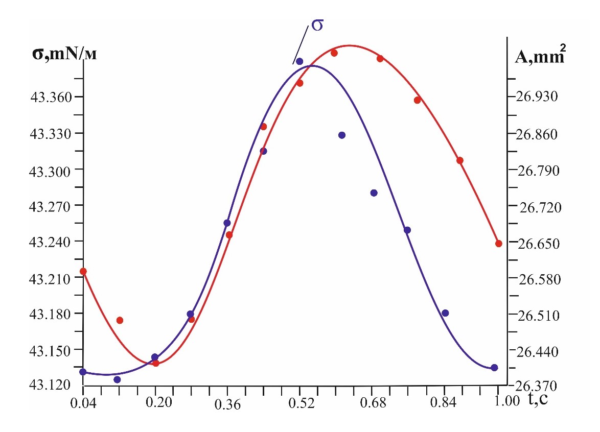 Рисунок 6 - Сравнение кривых площади (А), осциллирующей капли и величины поверхностного натяжения (σ) во времени (t)