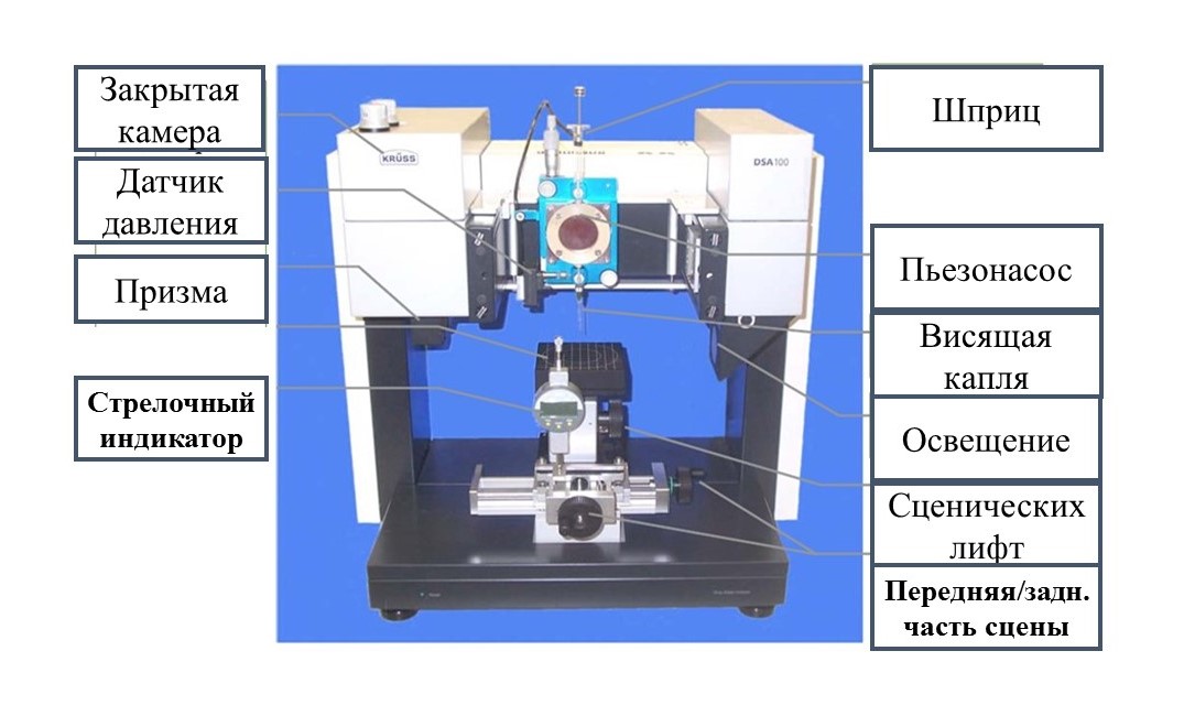 Тензиометр DSA-100 (Рис. 1) с реологическим модулем включает электронный шприц-модуль для создания осциллирующих капель на конце рабочего капилляра. Исследуемая жидкость поступает в капилляр посредством пьезонасоса, контролируемый компьютером. Возвратно-поступательные перемещения в исследуемой жидкости порождают синусоидальные колебания площади ПН. Программное обеспечение анализирует изменения межфазного натяжения, которое вызвано синусоидальным увеличением и уменьшением площади поверхности капли. Из анализа фазового сдвига между соседними кривыми рассчитываются модуль вязкости и модуль эластичности.
