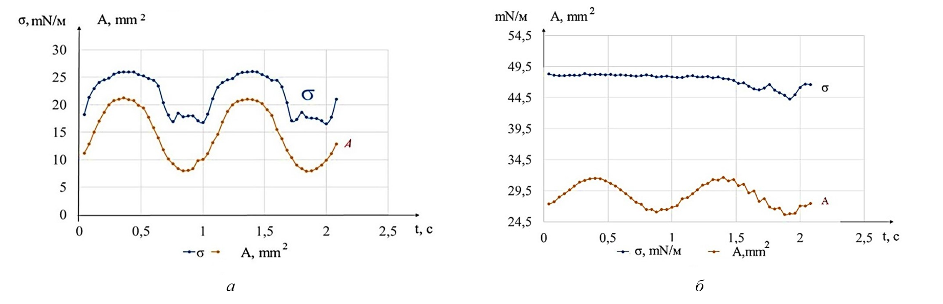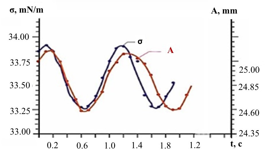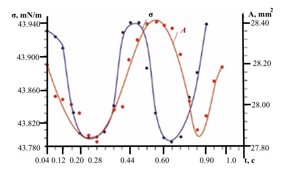 Рисунок 7 - Сравнение кривых площади (А), осциллирующей капли и величины поверхностного натяжения (σ) во времени (t)