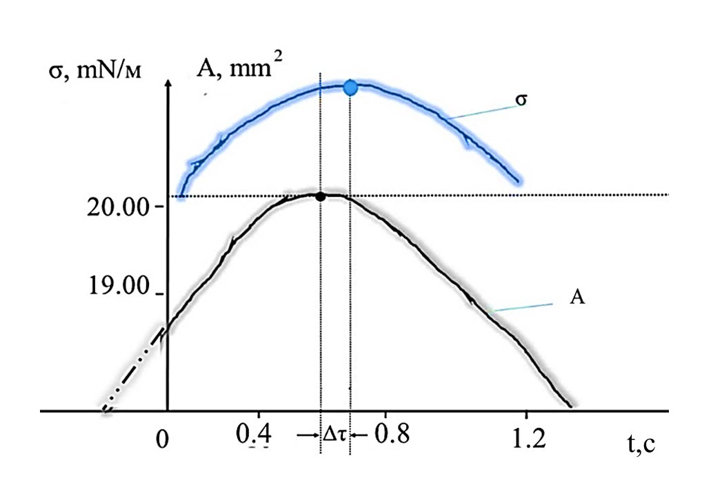 На рисунке 4 показаны усредненные графические модели кривых ПН и площади осциллирующей капли. Данный рисунок иллюстрирует одно полное колебание системы с фазовым сдвигом Δτ (параметр, зависящий от вязкости и эластичности пропанола-2) .
