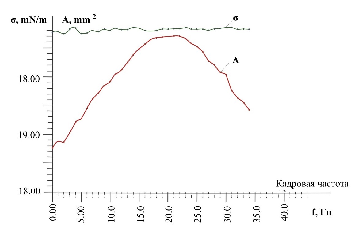 В системах, где использовались пропанол-2 или вода, наблюдалось отставание кривых ПН от объема осциллирующей капли. Так, на частоте равной 1 Гц кривая пропанола-2 относительно площади поверхности осциллирующей капли имеет фазовый сдвиг (∆τ). На частоте равной 2 Гц была зафиксирована периодичность ПН воды. На этой частоте осцилляции висящей капли воды (2 Гц с периодом равной 0,5 с) оптическая система просматривает форму капли 12,5 раз. Так как камера имеет частоту 25 кадров в 1 с. Тем не менее для оценки гистерезиса (отставание) кривой ПН воды частота камеры равная 12,5 изображений в секунду является достаточным условием.