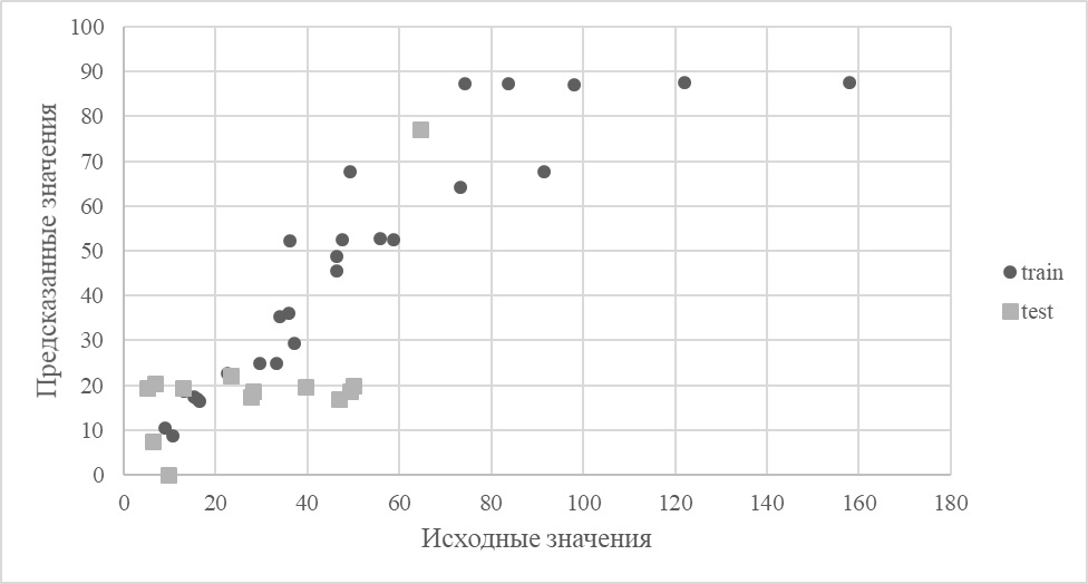 На рисунке 2 и рисунке 3 представлены результаты применения нейронной сети с двумя скрытыми слоями. На рисунке 2 изображена диаграмма зависимости между реальными значениями общей численности цианобактерий эпилитона и значениями, полученными нейронной сетью с двумя скрытыми слоями. Сеть с одним скрытым слоем показала лучшую зависимость на обучающих данных (не показана), чем сеть с двумя скрытыми слоями, однако тестовые данные лучше предсказывались сетью с двумя скрытыми слоями (рис. 2). Поскольку точность распознавания тестовой выборки является приоритетной задачей, то здесь представлены результаты для нейронной сети с двумя скрытыми слоями.