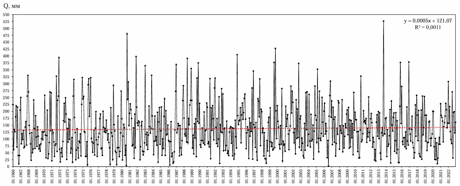 На рисунке 1 приведена динамика изменения месячных сумм осадков за рассматриваемый период на метеостанции в г. Сочи. Месячные значения сумм осадков на графике за рассматриваемый период варьируются от 2 до 525 мм. Минимальное количество атмосферных осадков (2 мм) за весь период наблюдений отмечалось в июле 2006 года. Максимальное количество осадков характерно для конца осени или начала зимы (ноябрь — декабрь). Наблюдается цикличность максимальных пиковых значений с интервалом раз в два года, между которыми количество осадков заметно снижается. Отмечается тенденция уменьшения значений амплитуд месячных осадков между самым сухим месяцем и самым влажным в течение года. Так, с 1966 по 2005 гг. годовая амплитуда варьировалась от 350 до 400 миллиметров, а после 2005 г. амплитуда снизилась до 250–300 мм. В целом, линия тренда, построенная для периода с 1966 по 2022 гг. показывает, отсутствие значимой тенденции в изменении сумм месячных осадков за указанный период.