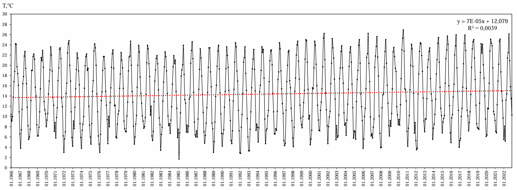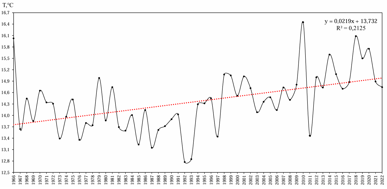 Среднегодовые температуры варьируются в диапазоне от 12,7 °C (1992 г.) до 16,5 °C (2010 г.). В период с 1982 по 1993 гг. зафиксировано заметное снижение среднегодовых температур воздуха, с наименьшими показателями в 1992 и 1993 гг. (12,7 °C и 12,8 °C соответственно). С 1994 г. по 2022 г. прослеживается стабильное повышение среднегодовых температур с незначительными колебаниями между соседними годами. За последние 30 лет среднегодовые значения выросли с 13,7 °C (1994 г.) до 14,9 °C.