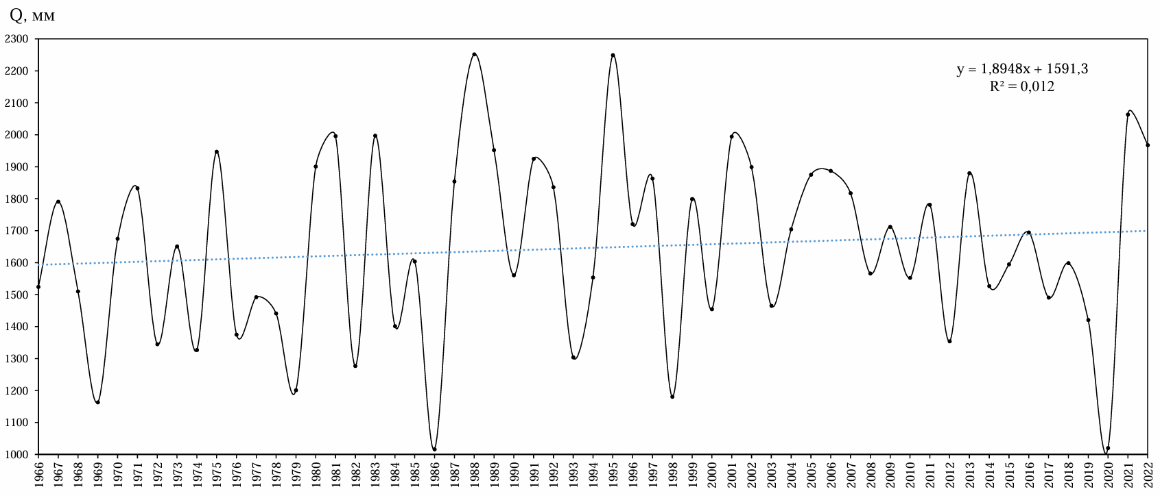 На рисунке 3 представлена графическая зависимость изменения суммы годовых атмосферных осадков, зафиксированных на метеостанции г. Сочи за период с 1966 по 2022 гг. Наименьшие годовые суммы осадков, что является аномалией для данного региона, зарегистрированы в 1986 и 2020 гг. — 1013 и 1019 мм соответственно. В интервалах 1976–1979 гг. и 1984–1986 гг. суммы осадков оставались на относительно низком уровне без резких изменений. Наибольшие значения годовых осадков зафиксированы в 1988 и 1995 гг. — 2260 и 2255 мм соответственно.