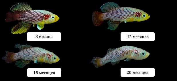 Рисунок 1 - Сравнение выраженности внешних признаков старения (снижение яркости окраски, искривление позвоночника, эрозия плавников, десквамация чешуи) у самцов Nothobranchius guentheri разного возраста