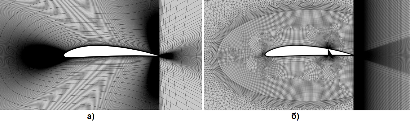 Для моделирования методом конечных элементов была построена расчетная сетка. Для профиля без механизации использовалась структурированная четырехугольная сетка типа Mapped (рис. 3а). Построить такую сетку для профиля с закрылком оказалось затруднительно ввиду более сложной геометрии рассматриваемого профиля, поэтому в этом случаи использовалась комбинированная сетка, которая включала в себя четырехугольные элементы типа Mapped, которые были использованы в области за профилем и Free Quad, которые использовались вблизи профиля («кокон» на рис. 3б). Также были задействованы треугольные элементы типа Free Triangular, которые использовались на остальной геометрической области (рис. 3б). Помимо этого, все профили имели погранслойную сетку с количеством слоев не менее 40 для точного расчета скоростей и давлений воздуха в пристеночных областях (рис. 3).