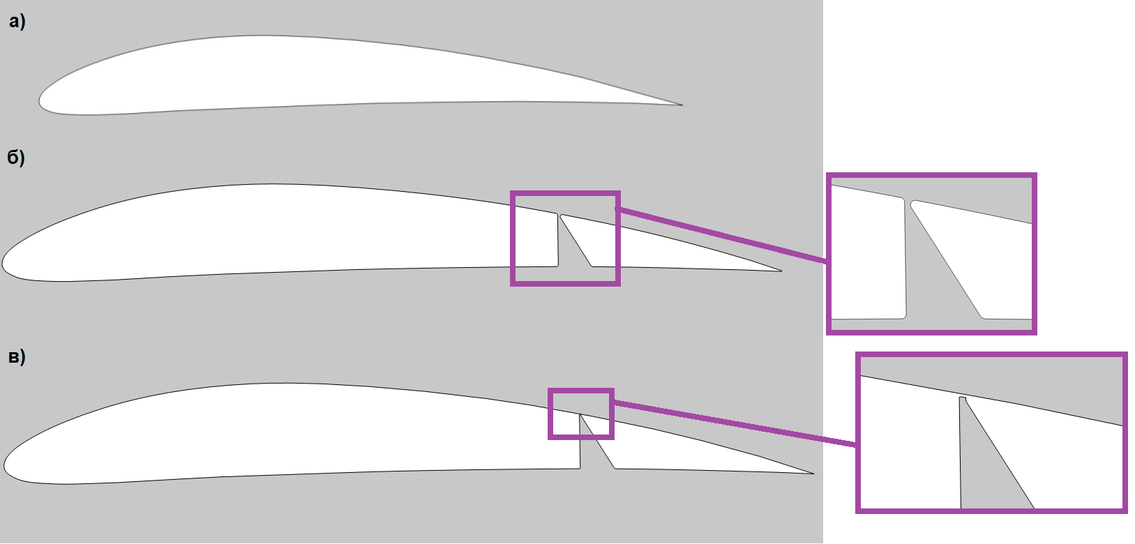 Рисунок 1 - Изображения профилей крыла без закрылка (а), с закрылком, но с зазором между крылом и закрылком (б) и с закрылком без зазора (в)