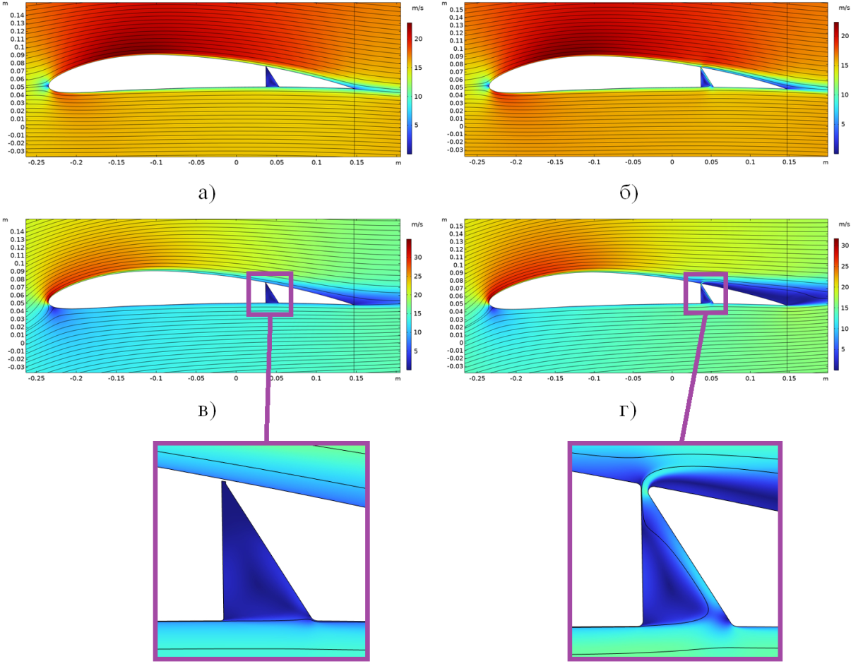 а) профиль без зазора, угол атаки 0°; б) профиль с зазором, угол атаки 0°; в) профиль без зазора, угол атаки 9°; г) профиль с зазором, угол атаки 9°