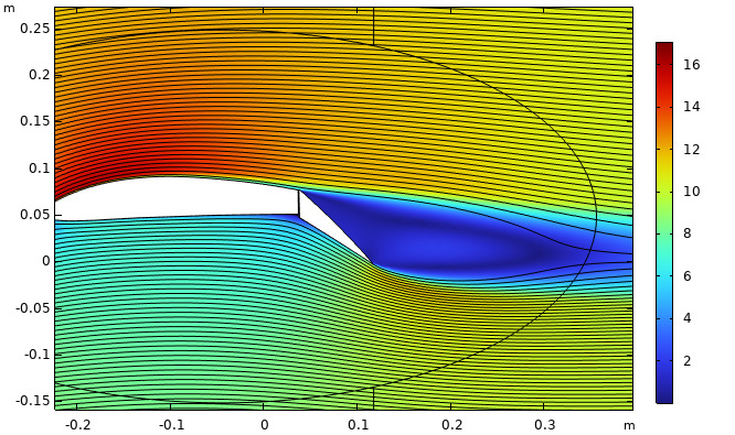 Рисунок 5 - Изображения распределения полей скоростей воздуха вокруг рассматриваемого профиля с закрылком при скорости 16,7 м/с: