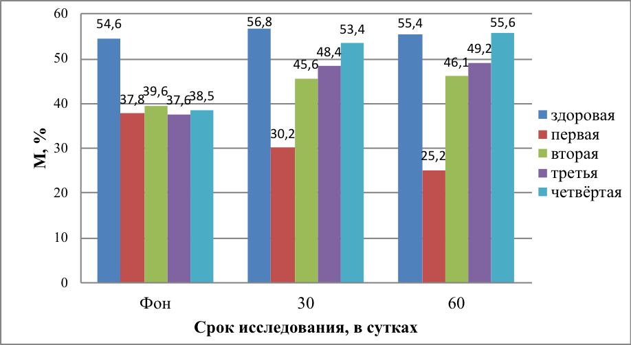 Фон | 37,8±1,23 | ≤0,001 | 12 | 39,6±0,94 | ≤0,001 | 12 | 37,6±1,02 | ≤0,001 | 12 | 38,5±0,88 | ≤0,001 | 12 | 54,6±1,69 |