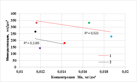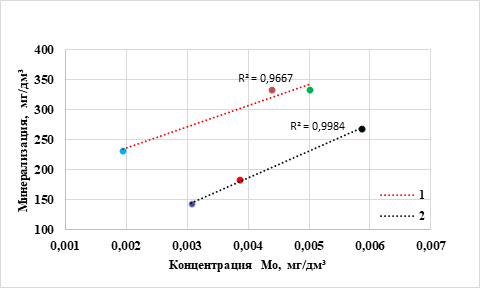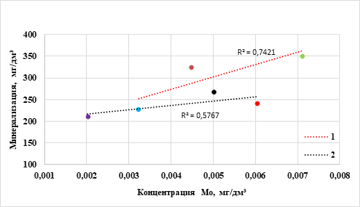 On the basis of the performed calculations, the dependence of molybdenum and manganese concentration on the value of mineralisation of water of the rivers Baksan and Malka for the studied period is shown and coefficients of determination are obtained.