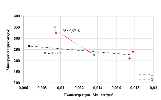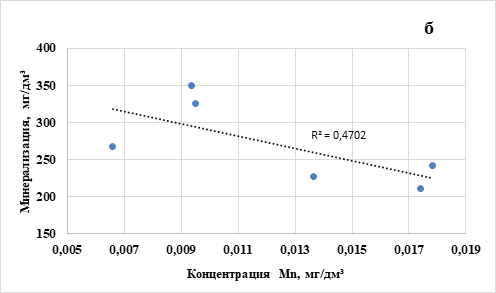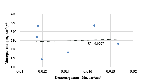 Возможно, одной из причин низкой корреляция, является привнос рекой Куркужин загрязняющих веществ, которые влияют на значения минерализации и зависимость концентрации марганца от минерализации воды в р. Малка в указанном периоде