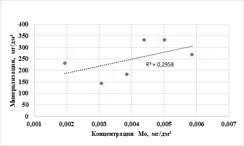Рисунок 3 - Среднемноголетняя зависимость концентрации молибдена от минерализации в воде р. Малка за 2022-2024 гг