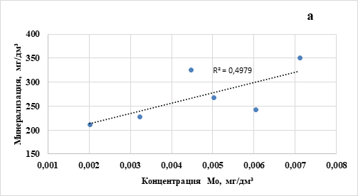 Objective: to identify dependences of molybdenum and manganese concentrations on the values of mineralisation in the water of the Baksan and Malka rivers in the estuaries for 2022–2024, and to evaluate the values of coefficients of determination.