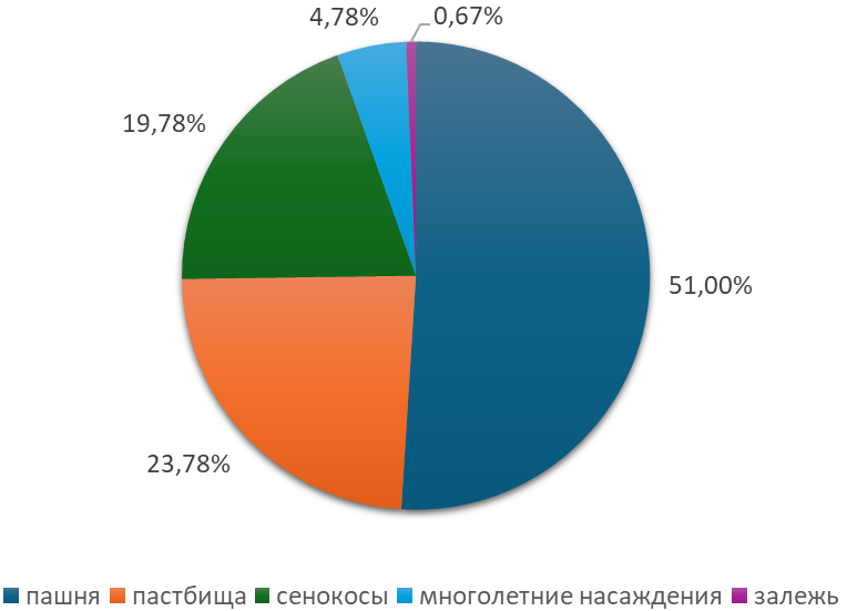 По состоянию на 1 января 2023 года общая площадь сельскохозяйственных земель в Камчатском крае составила 186,9 тыс. гектаров, что всего лишь 0,4% от общей площади земельного фонда края. На рисунке 1 представлена структура сельскохозяйственных угодий. Обеспеченность населения края сельскохозяйственными угодьями составляет 1,5 га на человека, что соответствует среднему уровню в России. Однако обеспеченность пашнями здесь в 4 раза ниже, чем в среднем по стране. По рисунку видно, что пашни составляют большую часть структуры сельхозугодий — 51%. Распределение пашен в муниципальных районах неравномерно, поскольку большинство участков находится в долевой собственности. Требуется выделение отдельных долей для их активного использования.
