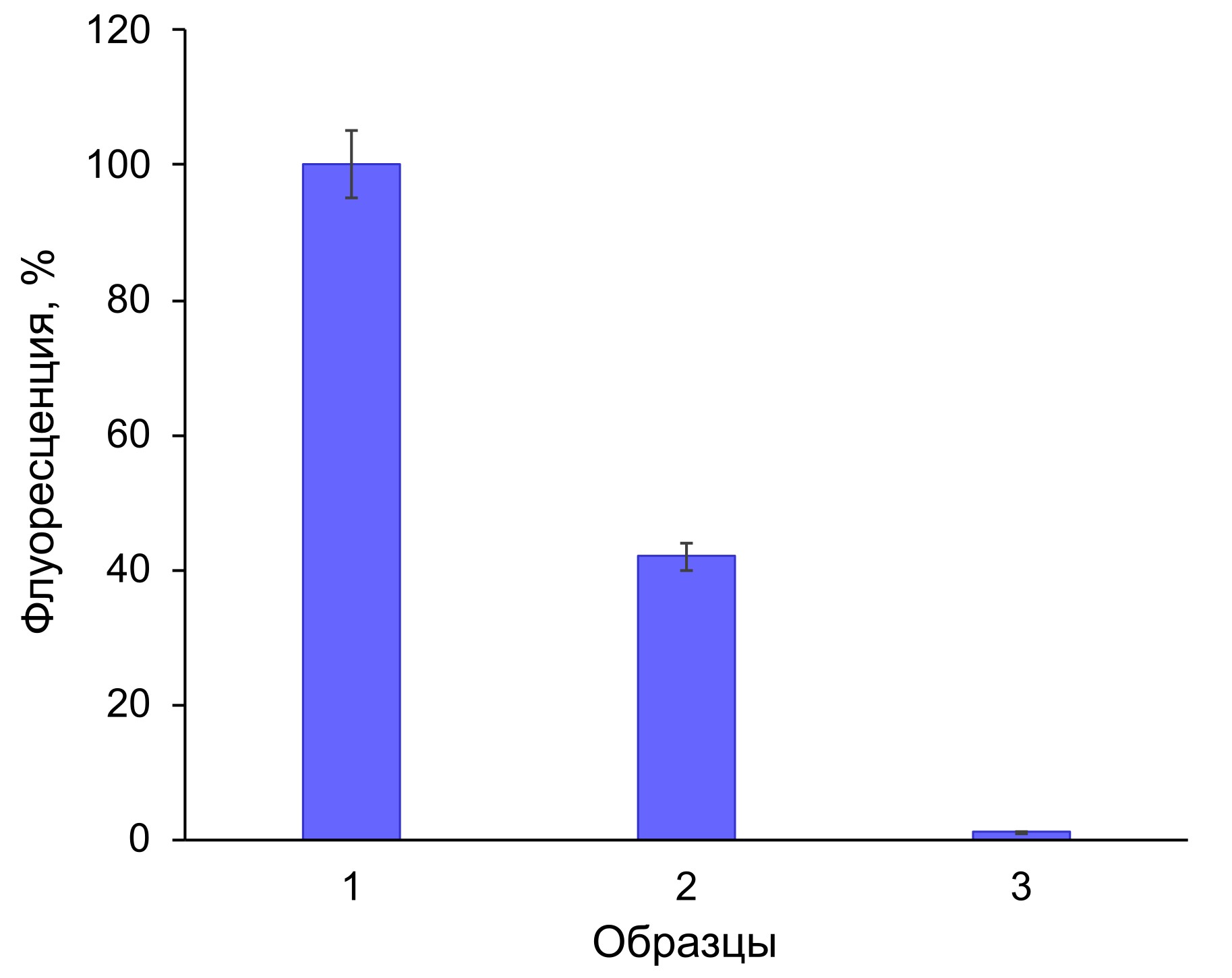 1 – исходный раствор флуорофора; 2 – супернатант после инкубации флуорофора с частицами сорбента и последующего их осаждения центрифугированием; 3 – супернатант после промывки частиц носителя ДИ водой и последующего их осаждения центрифугированием