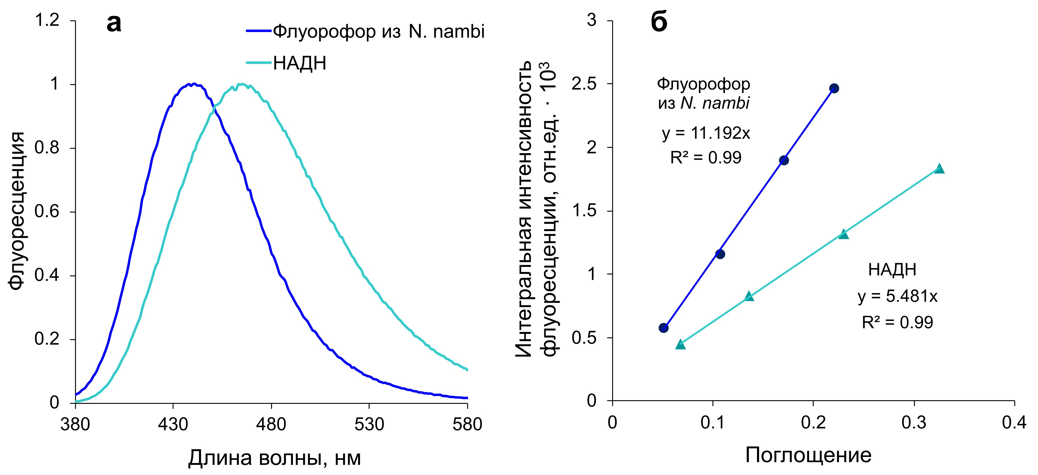 Известно, что квантовый выход флуоресценции является одной из важнейших фотофизических характеристик вещества, обладающего флуоресцентными свойствами , . В наших исследованиях квантовый выход световой эмиссии флуоресцирующего в синей области спектра компонента из базидиомицета N. nambi мы определяли в сравнении с НАДН. Этот восстановленный пиридиновый нуклеотид был выбран нами в качестве эталона сравнения, поскольку он так же, как и изучаемый грибной флуорофор, излучает свет в синей области спектра и для него известна величина абсолютного квантового выхода . При этом нужно заметить следующее. Хотя у НАДН и грибного флуорофора длины волн возбуждения (335 нм и 350-370 нм соответственно) и максимумы световой эмиссии (465 нм и 440 нм соответственно) имеют различия, тем не менее, спектры флуоресценции обоих соединений в значительной степени перекрываются (рис. 1). Как показали расчеты, проведенные на основании полученных нами калибровочных зависимостей интегральной флуоресценции от величины поглощения для водных растворов обоих соединений (рис. 1), относительный квантовый выход световой эмиссии флуорофора из базидиального гриба N. nambi составил 0,04.