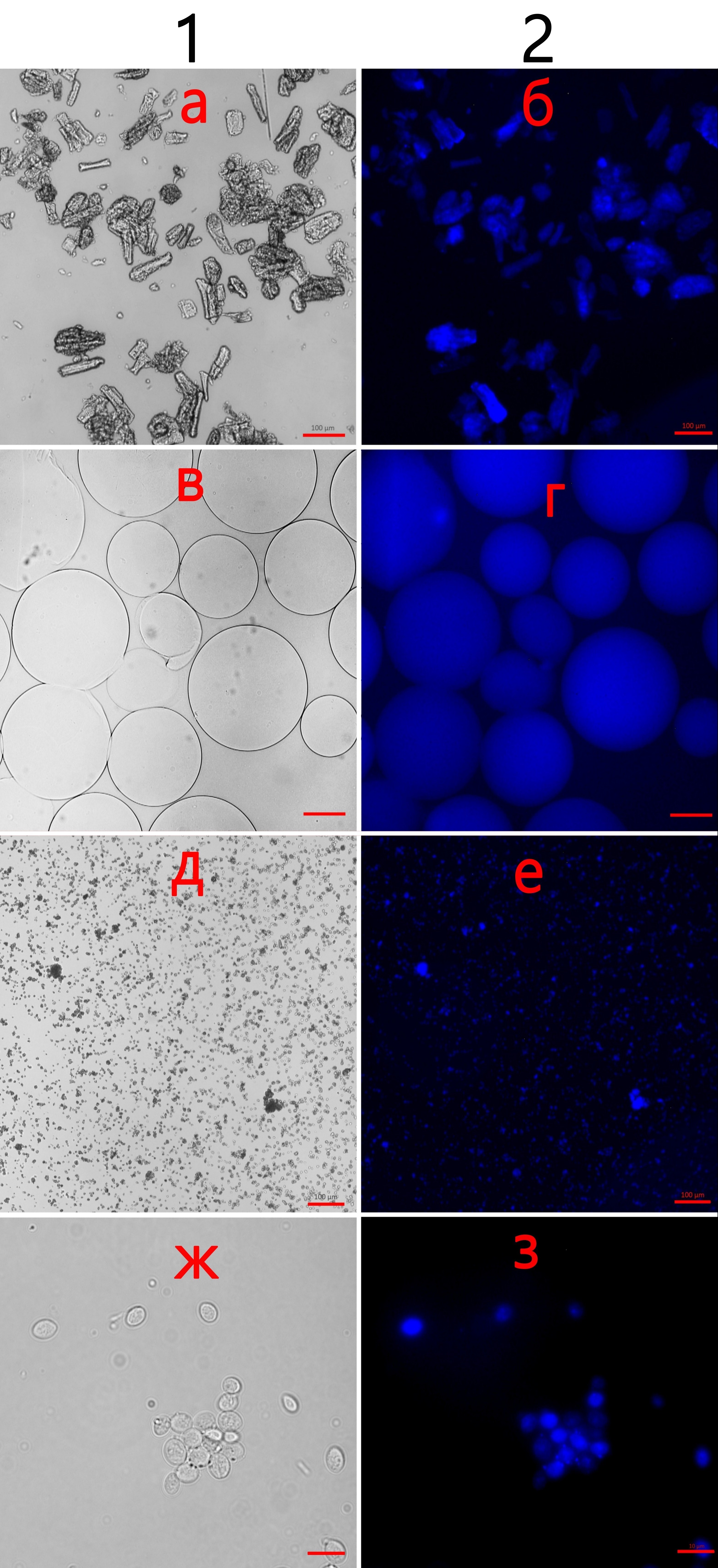 Рисунок 2 - Внешний вид (столбец 1) и флуоресценция (столбец 2) разных типов носителей с адсорбированным синим флуорофором из базидиомицета N. nambi: