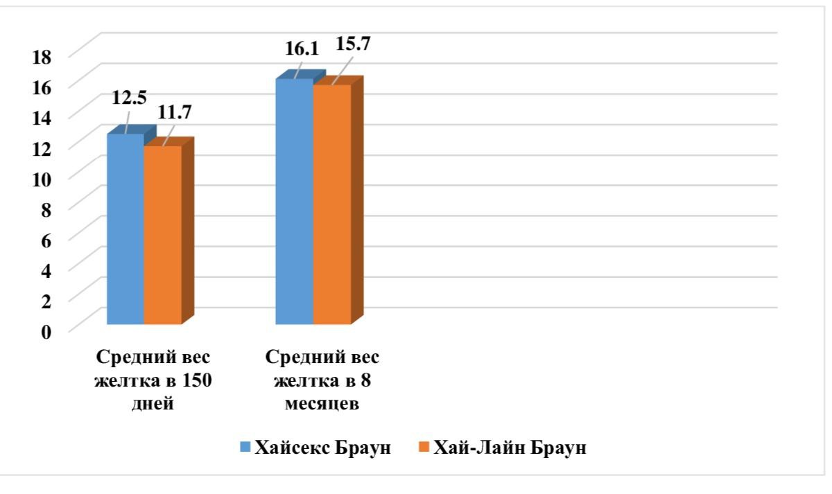 Рисунок 5 - Средняя масса желтка кур-несушек кроссов Хайсекс Браун и Хай- Лайн Браун в 150 дней и 8 месяцев.