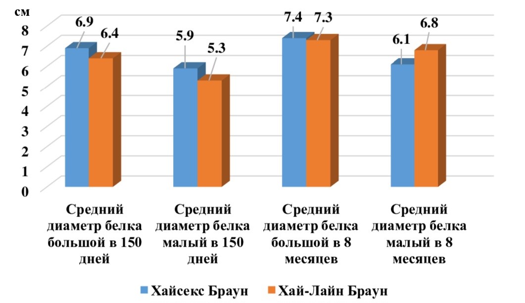 Рисунок 6 - Средний диаметр белка (большой и малый) кур- несушек кроссов Хайсекс Браун и Хай-Лайн Браун в 150 дней и 8 месяцев